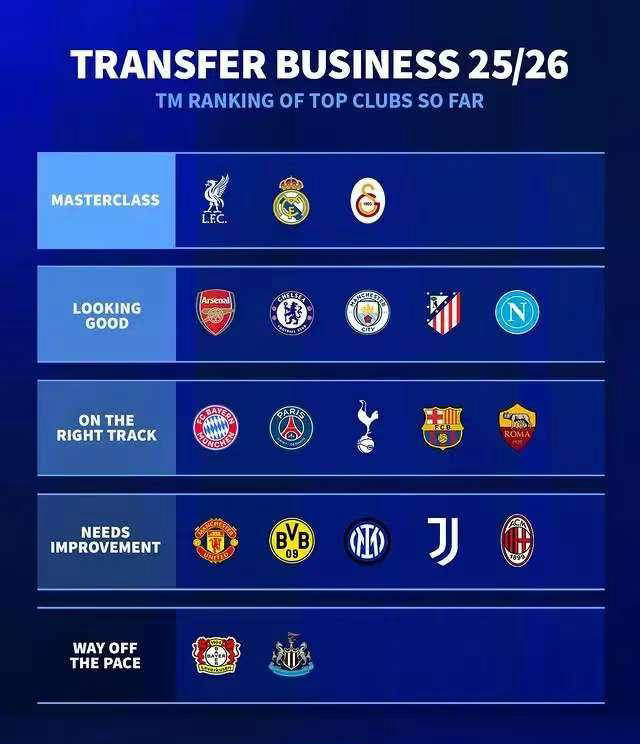 在每个转会窗口,其他联赛歇赛期间,德甲市场总是通过转会活动来引发关注,为足球界带来一些热度。在2025-2026赛季的夏季转会窗口中,德甲官方也发布了对欧洲各支球队进行转会运作评级的榜单。需要指出的是,这份榜单并不包含所有球队,主要涉及欧洲五大联赛的俱乐部,中小球队并未被纳入评估范围,所以更多只是豪门的转会盛况。